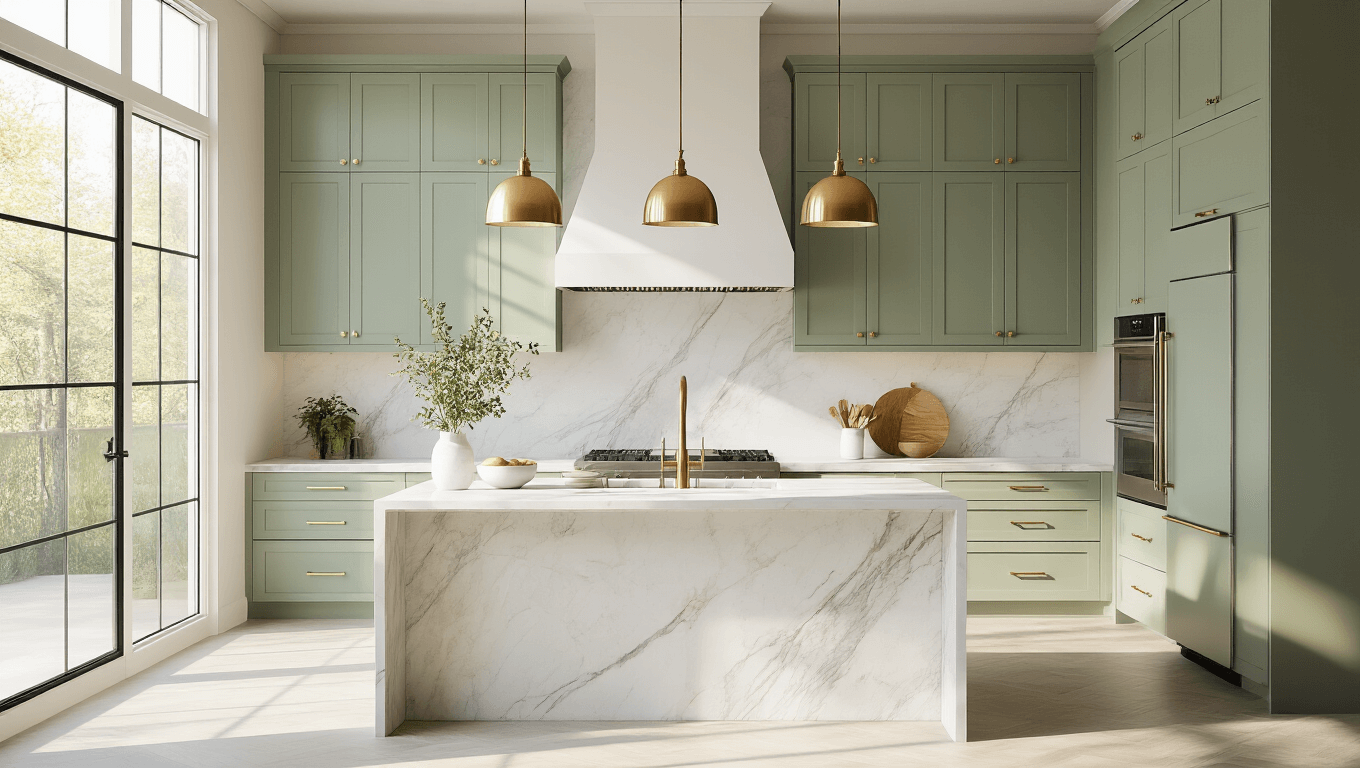 Contemporary 12x15ft kitchen featuring sage green shaker cabinets, marble waterfall island, brass pendant lighting, and expansive floor-to-ceiling windows flooding the space with natural light.