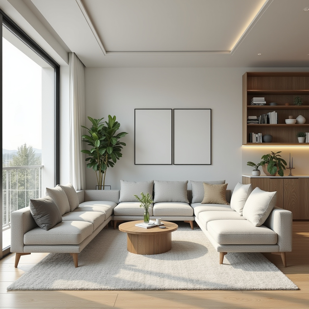 The combination of plush upholstery and warm oak tones fosters a serene ambiance, while carefully positioned indoor plants inject vitality, seamlessly integrating nature into the minimalist aesthetic.