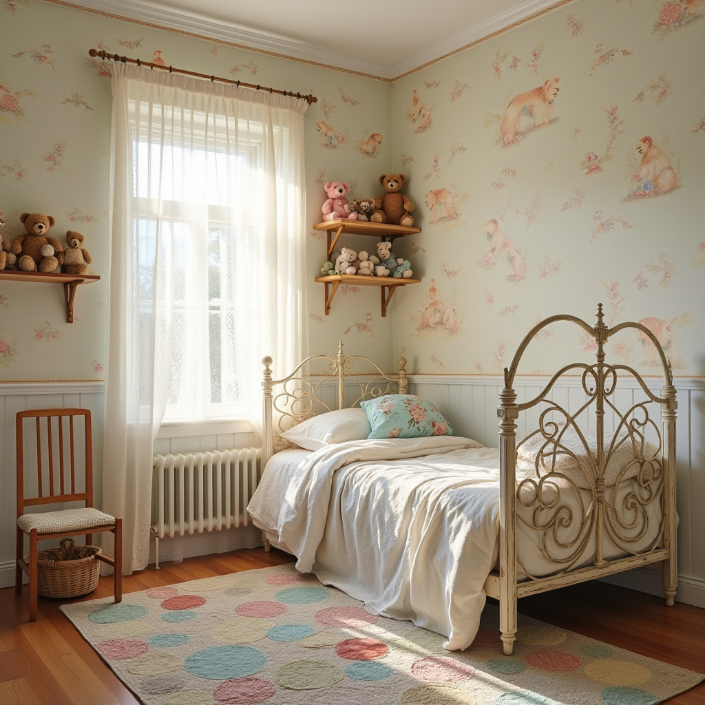 Reclaimed wooden shelves showcase a collection of classic teddy bears, infusing warmth and personality. A handmade patchwork quilt in soft, muted tones offers cozy comfort, ideal for storytime or naps. Lace curtains filter natural sunlight, casting a soft glow that highlights the room’s nostalgic textures.