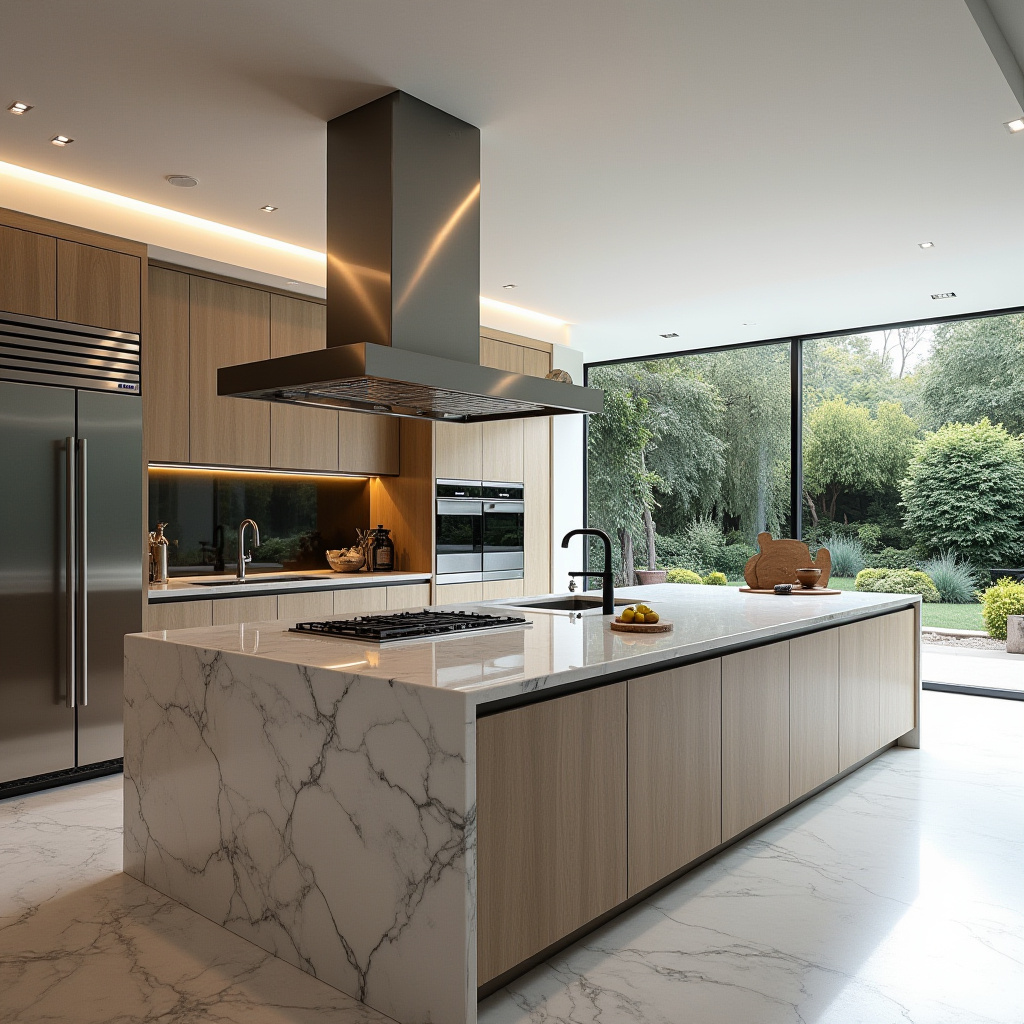 This modern kitchen centers around an expansive island topped with a dramatic waterfall quartz countertop, blending luxury with practicality. Floor-to-ceiling windows flood the room with natural light, offering serene views of a manicured garden and creating a seamless indoor-outdoor connection.