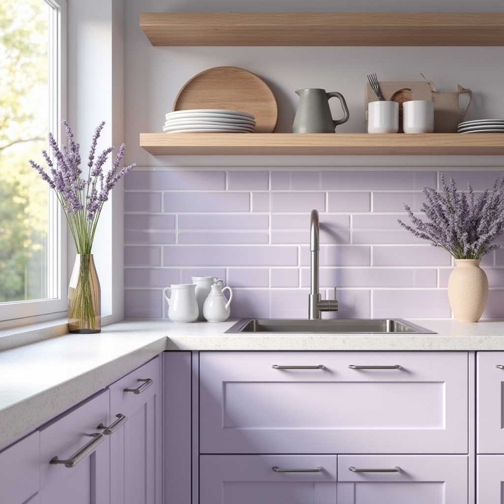 Elevate your kitchen with a backsplash featuring soft pastel lavender subway tiles that create a peaceful focal point against sleek white quartz countertops. Complement this with brushed nickel fixtures for a contemporary flair, and open shelving adorned with dried lavender bundles and artisanal ceramic pieces to add warmth and texture.