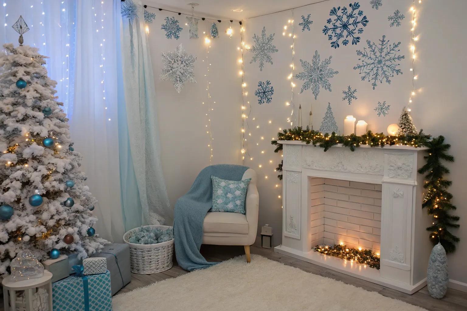 Adorn your walls with snowflake decorations crafted from diverse materials such as wood, metal, or paper to add depth and seasonal interest.