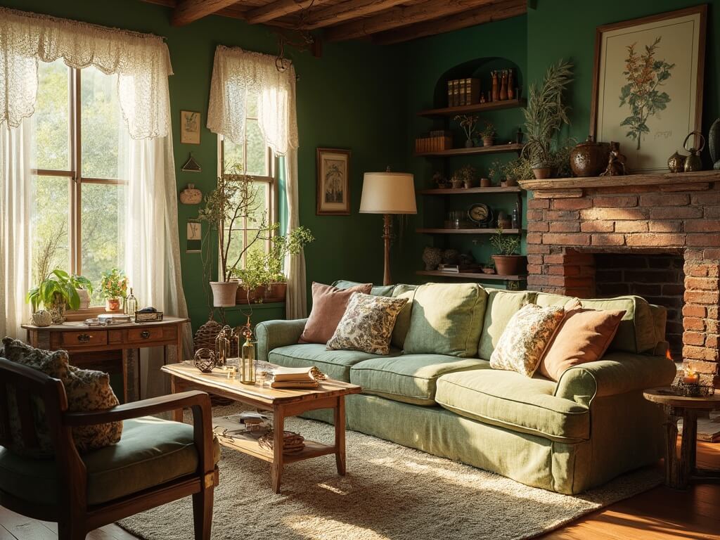 Cozy cottagecore living room with rustic furniture and natural light