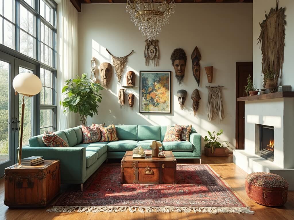 Bright living room with high ceilings, industrial windows, Persian rug, mint green mid-century sofa, brass accents, and African masks alongside modern art on ivory walls, softly lit.