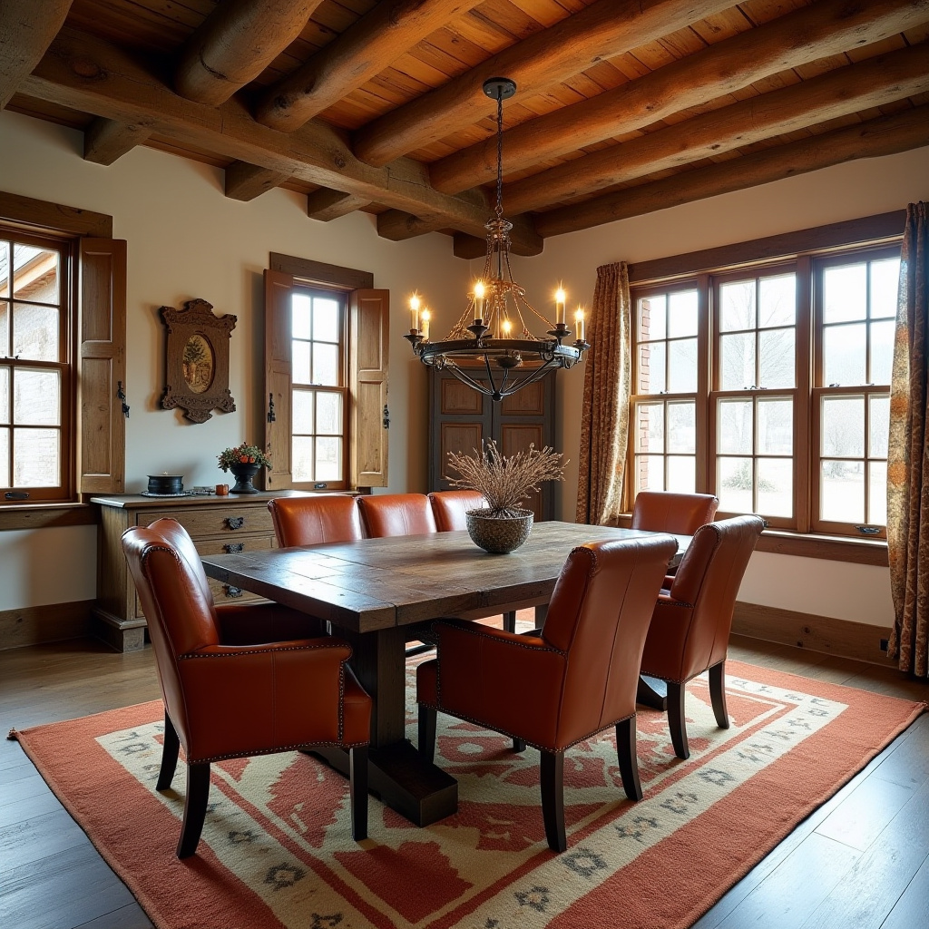 This farmhouse-inspired western dining room features robust wooden furniture, including a substantial dining table that anchors the space. Windsor-style leather chairs add comfort and rustic appeal.